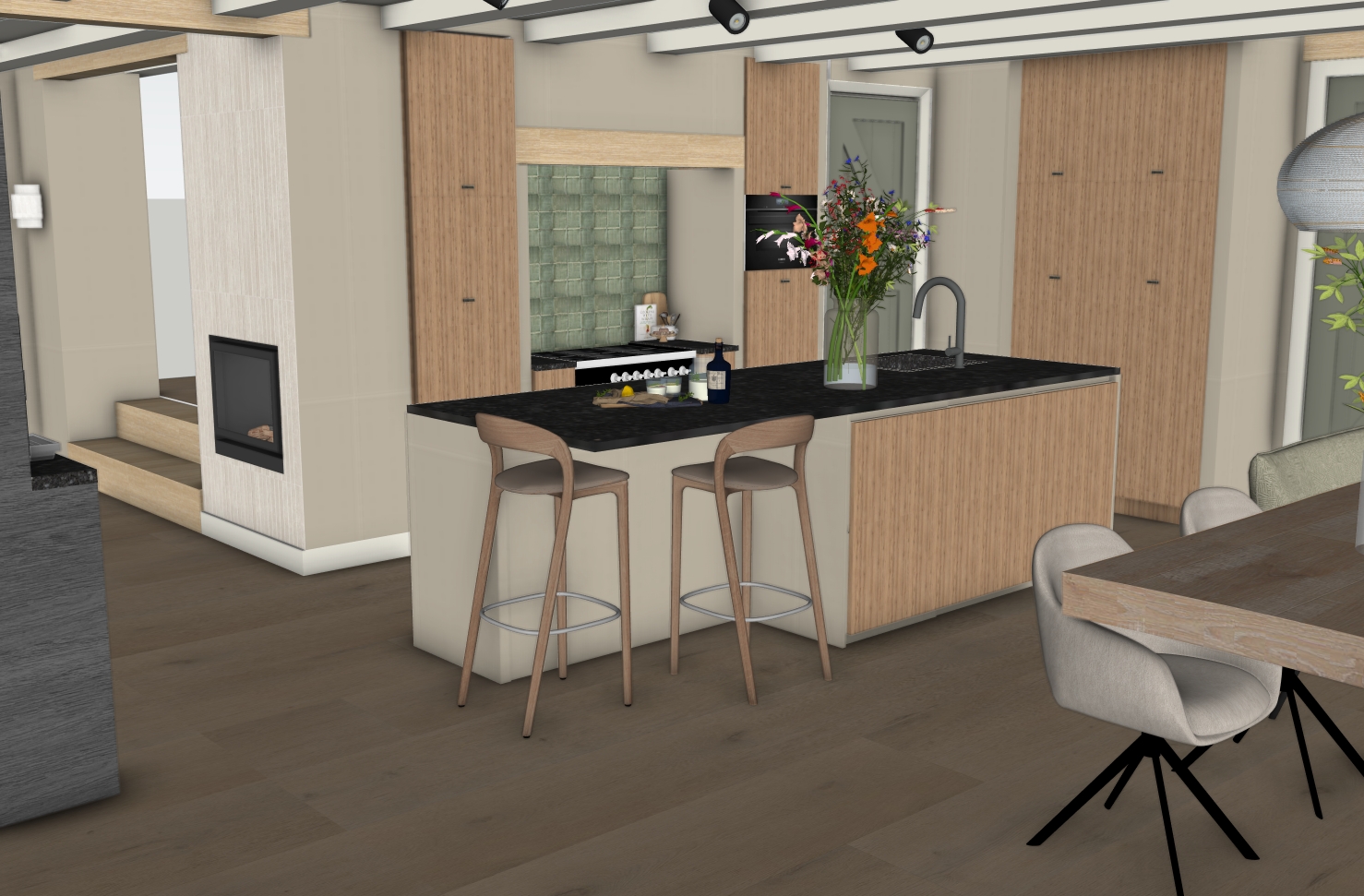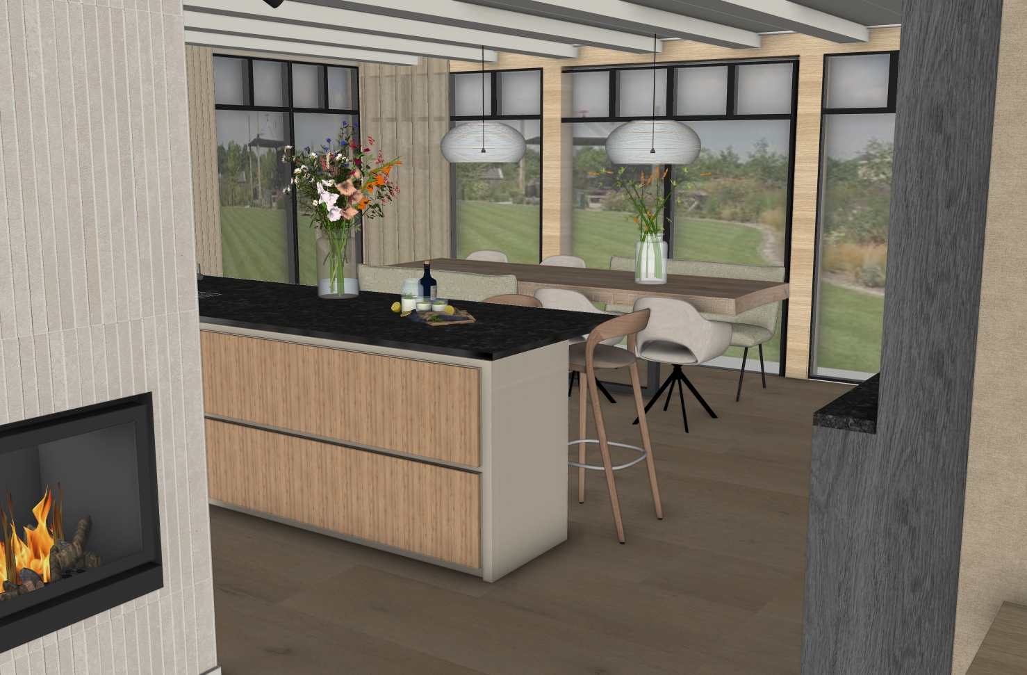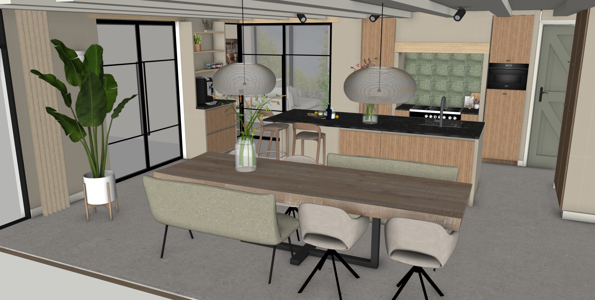 De bewoners hadden al een prachtig plan laten uitwerken door de architect, maar misten nog de vertaalslag naar het interieur. Er waren twijfels over verschillende keuzes en materialen. Door meerdere varianten uit te werken – met onder andere verschillende vloeren en de toevoeging van extra taatsdeuren – zijn nieuwe inzichten ontstaan. Dit gaf rust en duidelijkheid in het keuzeproces, zodat zij straks met nóg meer plezier kunnen genieten van hun prachtige woning.