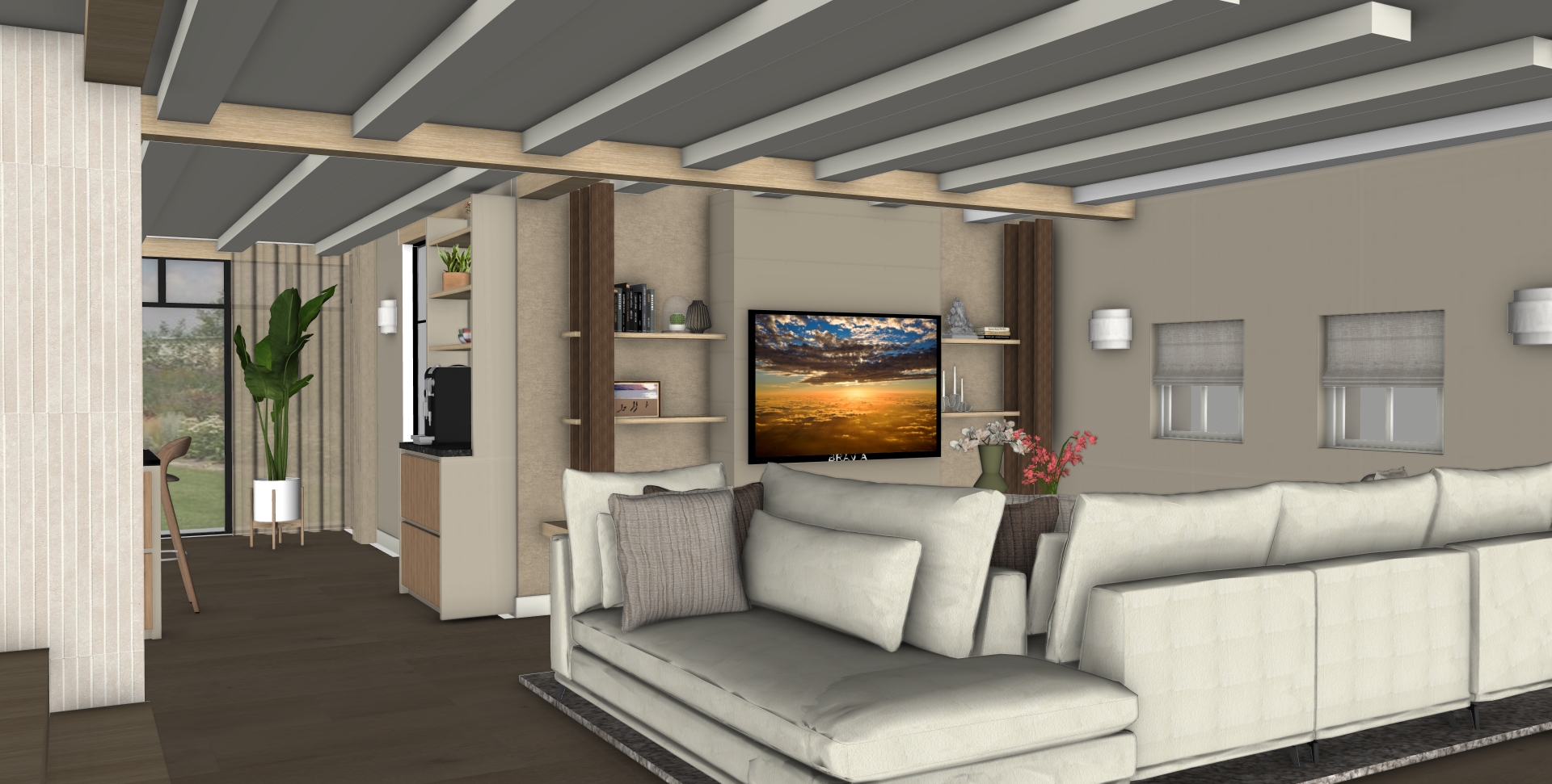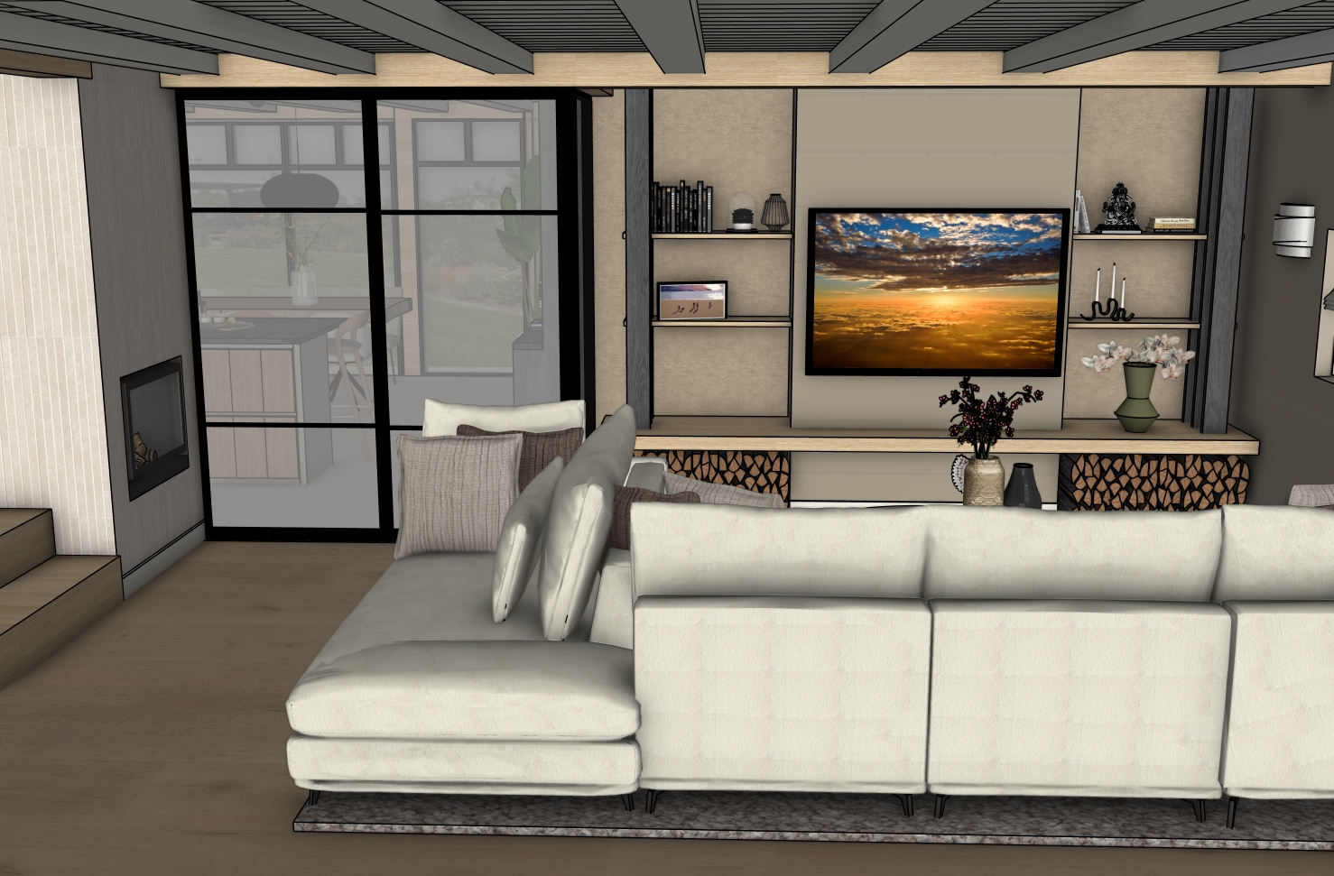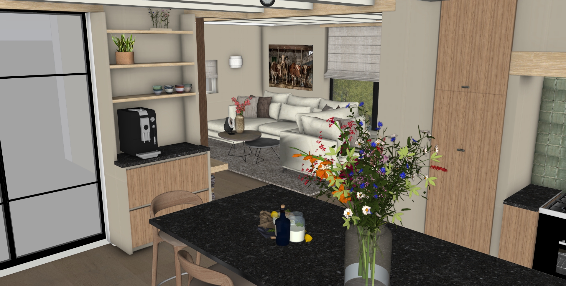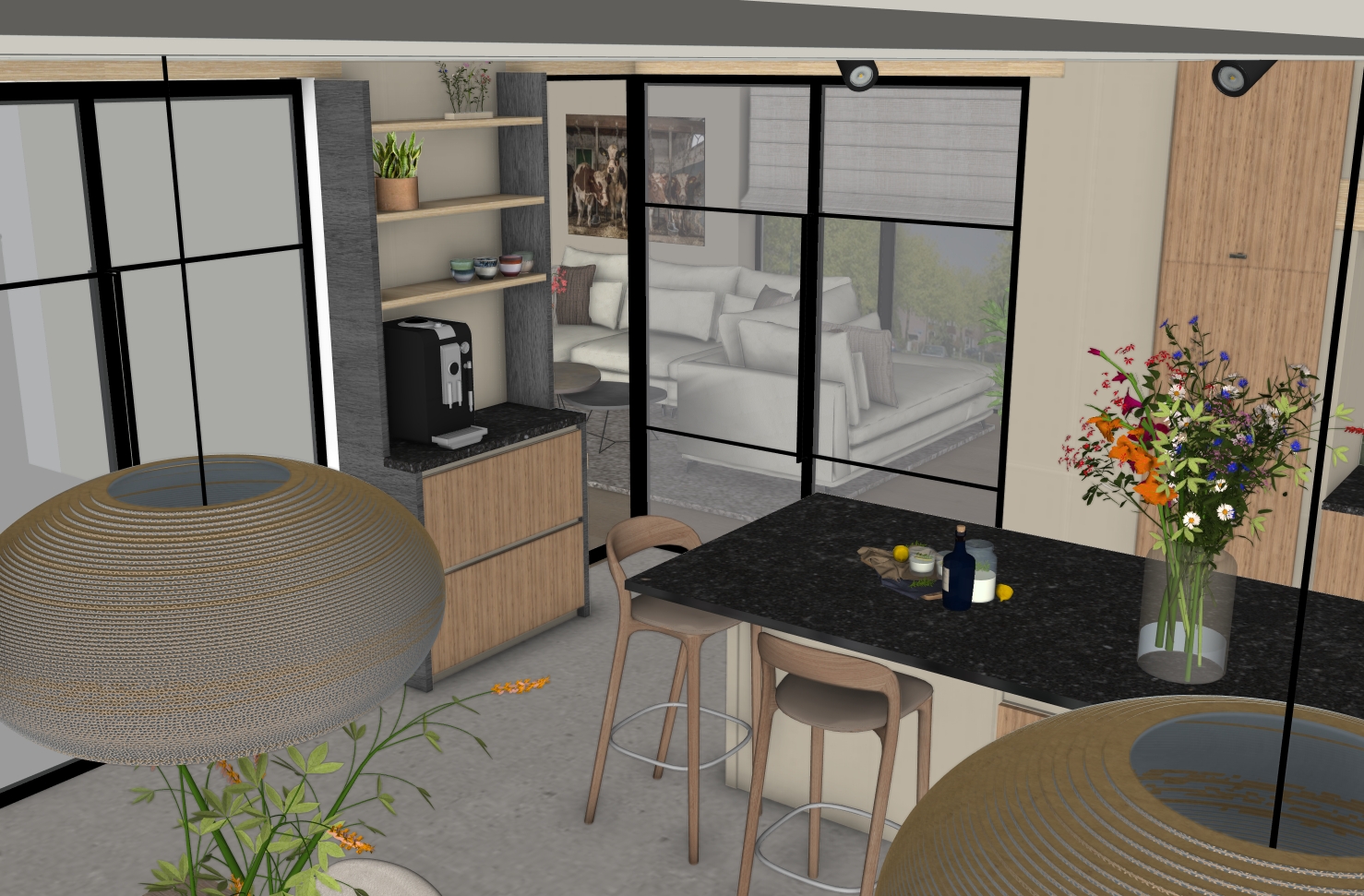 De bewoners hadden al een prachtig plan laten uitwerken door de architect, maar misten nog de vertaalslag naar het interieur. Er waren twijfels over verschillende keuzes en materialen. Door meerdere varianten uit te werken – met onder andere verschillende vloeren en de toevoeging van extra taatsdeuren – zijn nieuwe inzichten ontstaan. Dit gaf rust en duidelijkheid in het keuzeproces, zodat zij straks met nóg meer plezier kunnen genieten van hun prachtige woning.